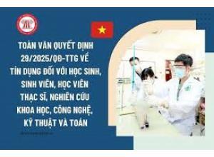 Quyết định 29/2025/QĐ-TTg về tín dụng đối với học sinh, sinh viên, học viên thạc sĩ, nghiên cứu khoa học, công nghệ, kỹ thuật và toánĐược đăng: Thứ năm, 11 Tháng 9 2025 09:41 | Tác giả: Nguyễn Viết Thừa | In bài này | Gửi Email bài này | Lượt xem: 160Ngày 28/8/2025, Phó Thủ tướng Chính phủ Hồ Đức Phớc ký Quyết định 29/2025/QĐ-TTg của Thủ tướng Chính phủ về tín dụng đối với học sinh, sinh viên, học viên thạc sĩ, nghiên cứu sinh học các ngành khoa học, công nghệ, kỹ thuật và toán. Attachments: File QD-29-ttg ve vay von tin dung HSSV cac nganh ky thuat va toan.pdf Xem thêm: Quyết định 29/2025/QĐ-TTg về tín dụng đối với học sinh, sinh viên, học viên thạc sĩ, nghiên cứu...